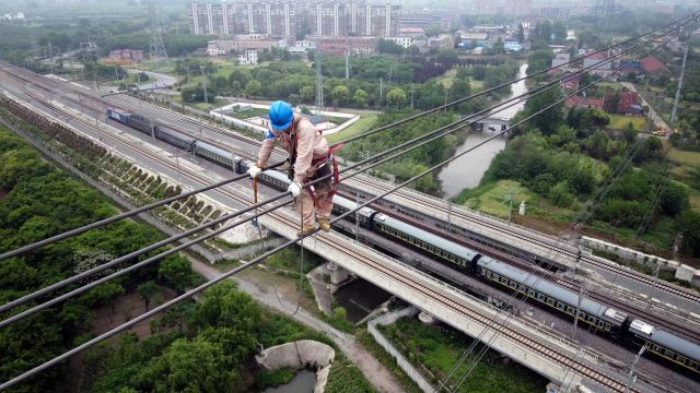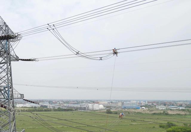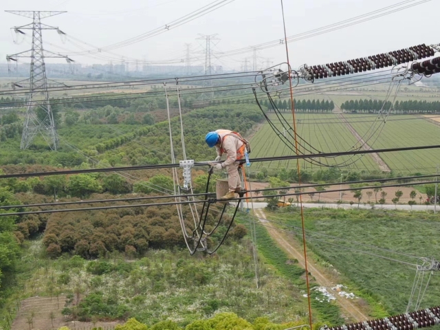 作业人员在位于刘桥镇测震村的500千伏苏殿5252线上进行走线检查。