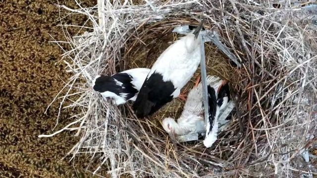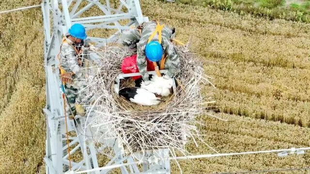 如皋一对东方白鹳在高压铁塔上筑巢并产下幼鸟,其中一只鸟宝宝的翅膀被铁塔的角铁卡住受伤。鸟类摄影爱好者发现这一情况后,向当地相关部门发去求助。5月29日下午,南通环境监测中心、如皋市生态环境局、如皋市自然资源和规划局、国网如皋市供电公司等多个部门单位迅速展开救援。两名电力工人登塔将受伤幼鸟带下后,由专业人士对它进行检查和救助。随后,这只幼鸟被送回巢内。