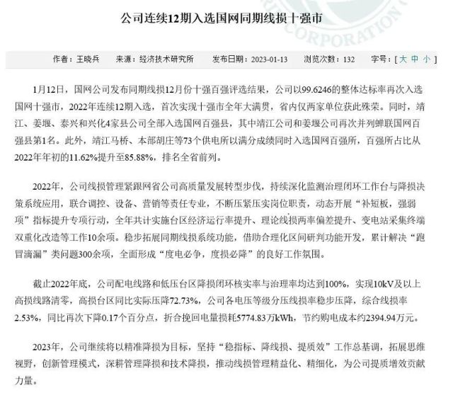同期线损管理关键业绩指标排名全省第一,首次连续12期入选国网“十强市”,实现2022年全年“全满贯”。