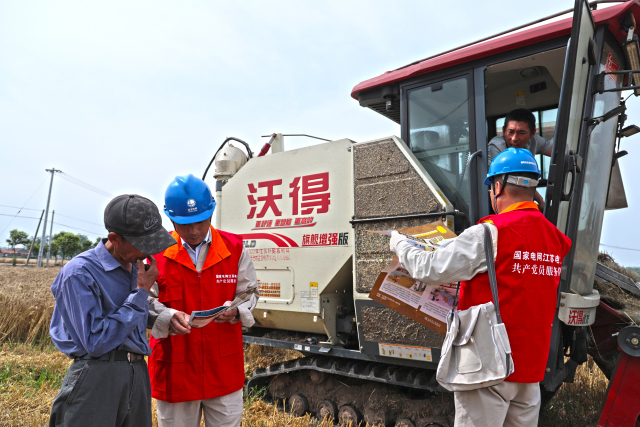 时值“三夏”大忙季节。为保障田间地头电力设施安全可靠运行,6月7日,国网宝应县供电公司夏集供电所党员服务队员朱晓军、荣峰,前往宝应县夏集镇苏雅村田间地头,向田间收割小麦的收割机驾驶员和当地农户宣传电力设施保护、安全用电知识,以及焚烧秸秆的危害性,提高群众共同“护电”意识。(郑宝元