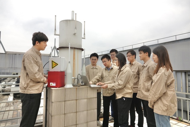 “电博士·动态防雷”青年集体在国网苏州供电公司大楼顶调试雷电探测装置。