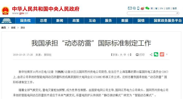2019年10月22日,国际大电网组织批复,“电博士·动态防雷”青年集体主导的世界首个“动态防雷”国际标准正式立项。目前,青年集体主导的标准已获国际大电网组织雷电专委会全票通过,将正式发布。