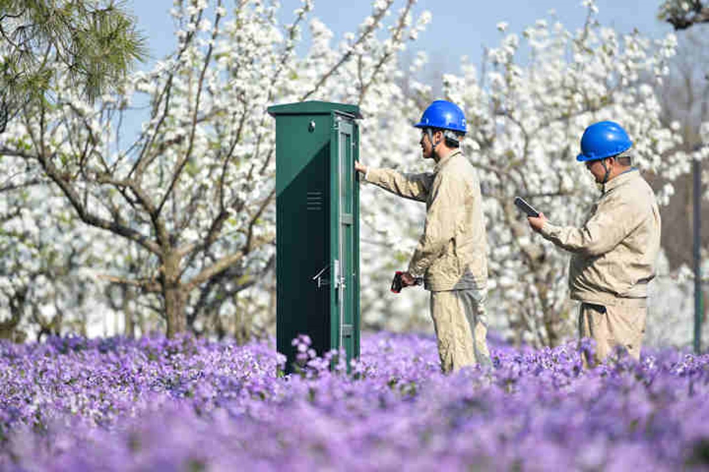 4月2日,宿迁三台山国家森林公园梨花、二月兰盛开,迎来旅游旺季。宿迁公司工作人员前往景区内检查维护供电设施,保障景区安全可靠用电。(吴迪)