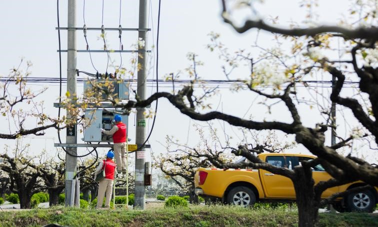4月7日,国网江苏电力(徐州真旺)共产党员服务队新沂十人桥分队队员来到马陵山镇梨园风景区,对景区高低压线路、配变进行安全检查,为“梨园庆春”民俗演出活动提供安全保障。(韦强强)