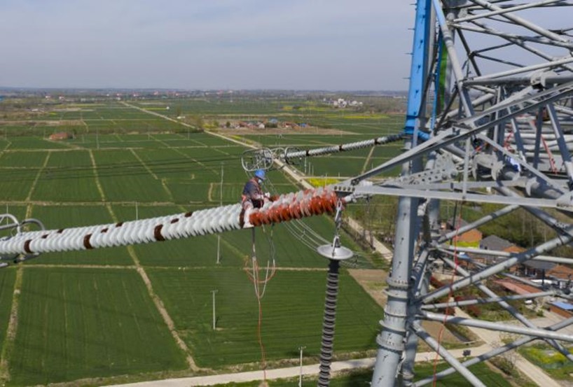 4月12日,超高压公司利用年度停电检修机会,在1000千伏盱泰线开展绝缘子防污闪喷涂工作。图为工作人员正在1000千伏盱泰II线37号塔进行喷涂作业。(罗怡德 王旭光)