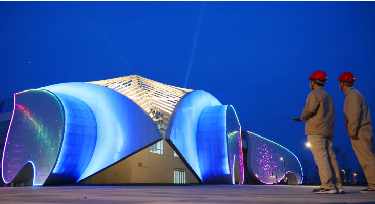 4月12日晚,连云港公司工作人员在连云港园博园帮助园区管理人员调试夜间亮化设备,为4月26日开幕的第十二届江苏省园艺博览会做好准备。(卢颖 申甲雁)