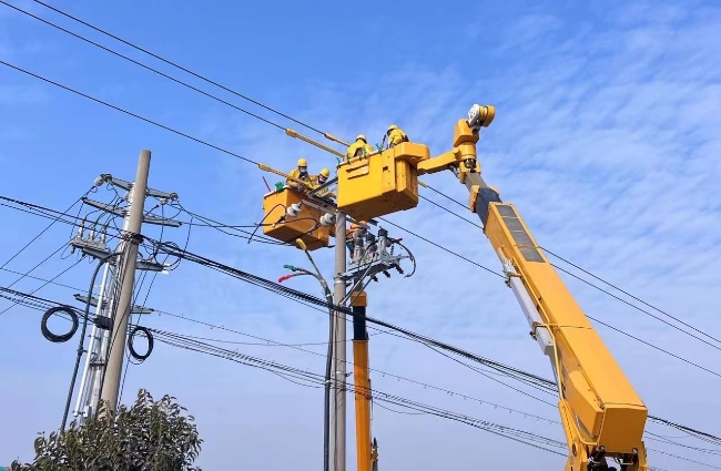 1月8日,徐州公司不停电作业人员在贾汪区10千伏汴茸线67号杆处,开展带电搭接耐张杆引线作业。(王晨宇)