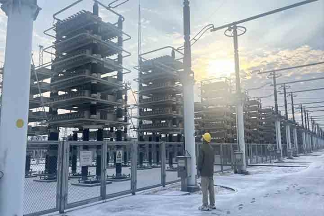 1月15日清晨,超高压公司运维人员在特高压盱眙(淮安)站内开展雪后特巡,保障雨雪天气下设备安全稳定运行。(武广斌)