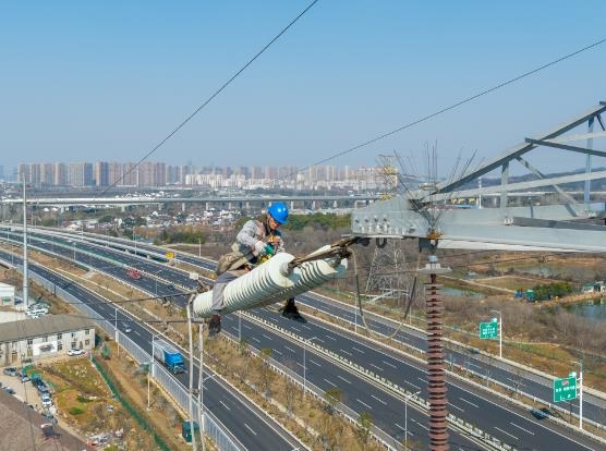 2月15日,南京公司对220千伏双胜线开展综合检修消缺工作。图为该公司输电运维人员正在导线上进行零值绝缘子检测。(杜懿 黄昭)