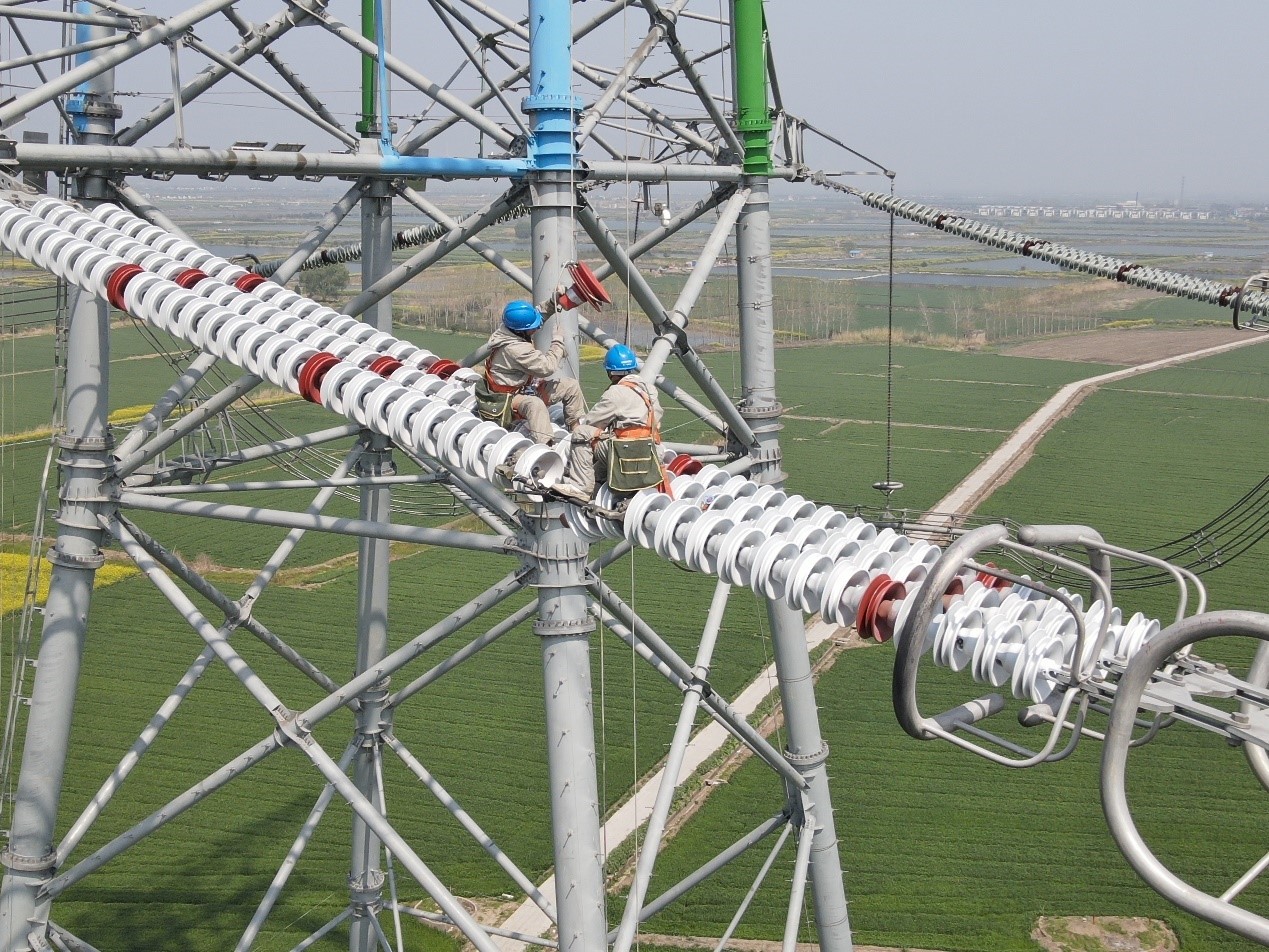4月18日,超高压公司工作人员正在盐城境内的1000千伏盱泰Ⅱ线255号塔上更换缘绝子。(康宇斌)