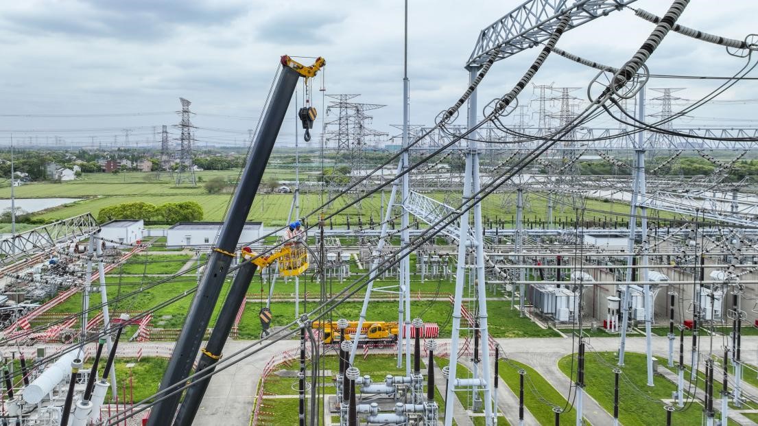 4月24日,在500千伏吴江变电站主变增容扩建工程现场,省送变电公司施工人员正在安装主变设备引下线。该站投运后,将进一步提升苏州500千伏主干网架消纳区外来电能力,满足区域内的用电需求。(史俊)