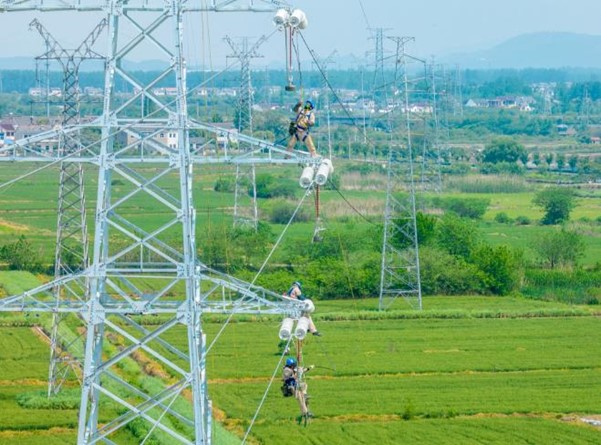 因328国道改扩建工程需要,南京110千伏六瓜线部分杆塔迁改“让路”。本次迁改工程拆除原杆塔3基,新立杆塔4基。图为4月26日南京公司工作人员在六瓜线迁改工程新立杆塔上安装绝缘子。(杜懿 邵海雯)