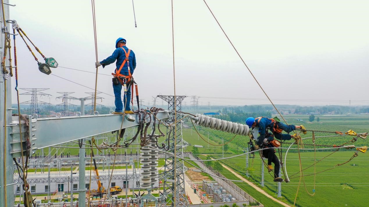 5月15日,在110千伏大洼—振丰线路工程建设现场,徐州丰县公司施工人员正在29号塔上进行牵挂线作业。目前,该工程已进入架线施工高峰期,投运后将提高丰县东南部新城区供电能力和供电可靠性。