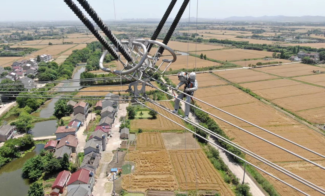 5月23日,超高压公司输电运检人员通过带电作业的方式,消除±800千伏建苏直流极Ⅱ3940号塔导线连接处销子缺失缺陷。(宋恒东)