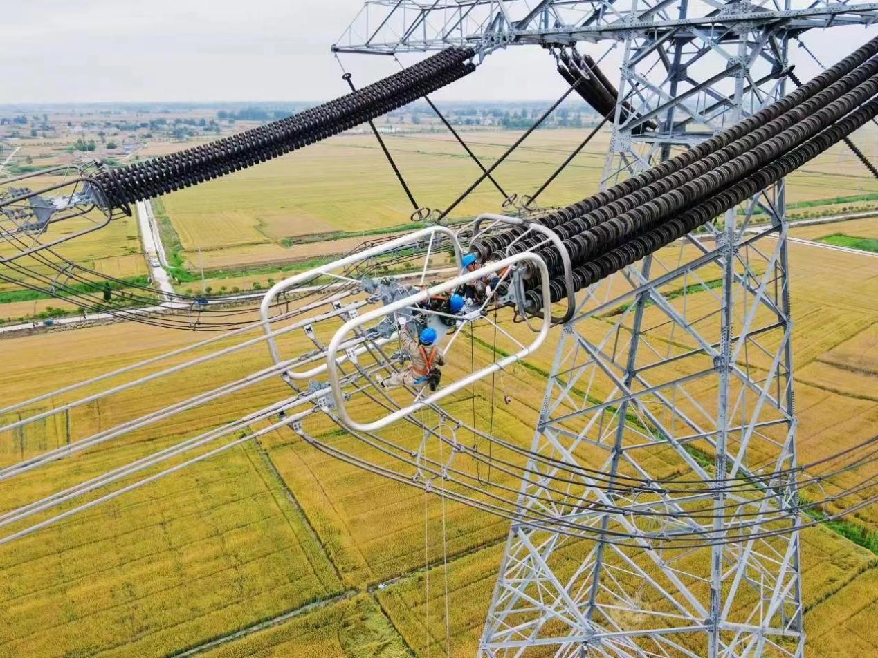 6月2日,超高压公司工作人员更换了±800千伏锡泰线连云港段2865号塔存在断裂缺陷的屏蔽环。(孙永强)