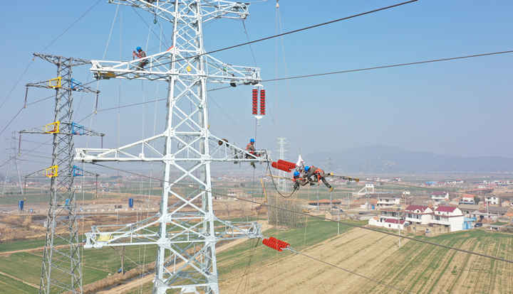 2月28日,在位于连云港市灌云县下车镇的110千伏邓车线春检现场,灌云县公司检修人员在高空对线路开展检修作业,及时更换老旧绝缘子,确保安全稳定运行。(任义刚)