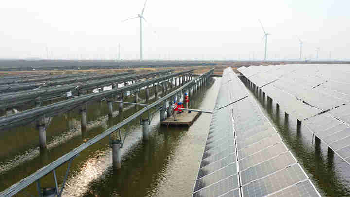 2月28日,南通如东公司共产党员服务队队员对当地集中式渔光一体光伏项目开展巡视,及时排查光伏设备及并网装置的安全隐患。(张浩 李冰清)