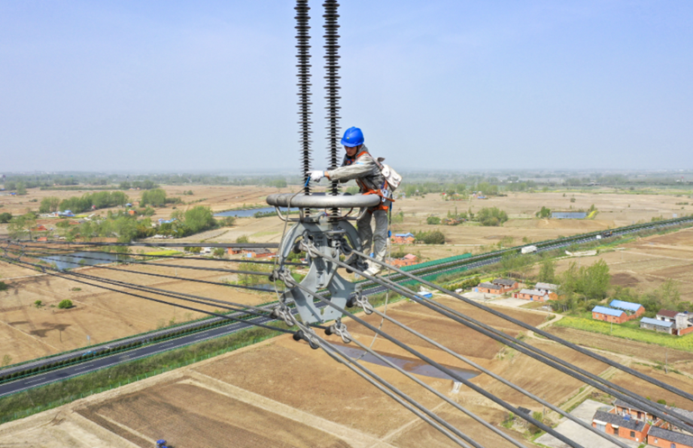 4月13日,淮安市1000千伏特高压盱泰II线春季检修现场,省送变电公司检修人员正在百米高空对输电线路的合成绝缘子进行检查。(史俊)