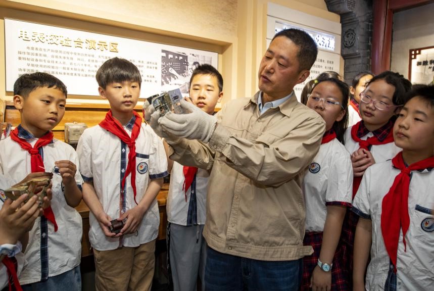 第47个国际博物馆日来临之际的5月16日,泰州姜堰公司工作人员在该公司“一块电表里的中国”博物馆内,向泰州市姜堰区第二实验小学康华校区的学生讲解电力计量科技发展的历史变迁。(李杨)