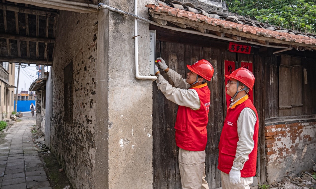 6月15日,国家电网江苏电力(通州连心桥)共产党员服务队队员为南通市通州区先锋镇花园村9组一老年居民用户检查配电箱,保障其安全用电。(陈磊 吴庆华)