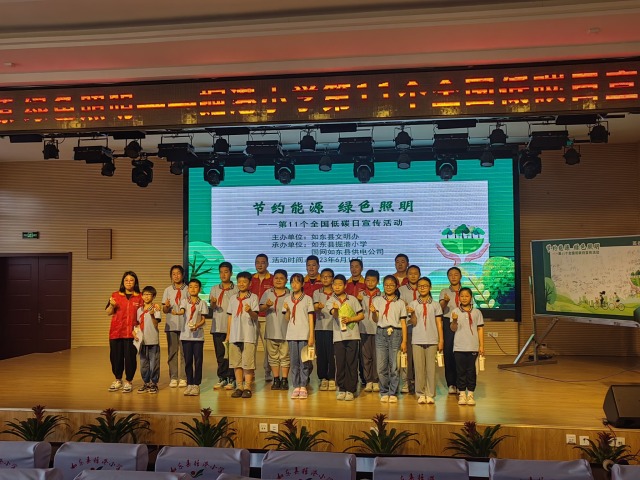 “同学们,你们知道全国低碳日是什么时候吗?”——“我我我!”、“我知道!”......随着如东公司员工吴佳颖在讲台上的提问,下面座位上一只只小手齐刷刷地举起,一张张小嘴里迫不及待地发出期盼。随着被选中的孩子站起,脆声声的一句“6月15号!”,掌声四起,一份学习用品被作为奖励送到答题人手上,孩子们喜笑颜开。这是6月15日下午,发生在如东县掘港小学多媒体教室里的情景。这天,如东公司的八名志愿者走进如东县掘港小学,开展了以“节约能源,绿色照明 争做小小引领人”为主题的低碳日宣传活动。