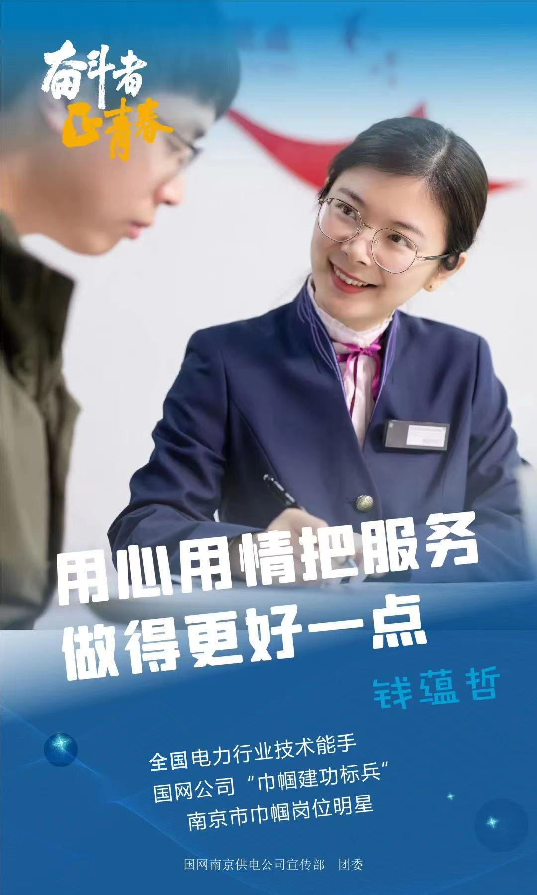 风华正茂,年轻有为。作为技术骨干的钱蕴哲先后获得全国电力行业技术能手、第二届全国电力行业青年培训师教学技能竞赛一等奖、国网公司“巾帼建功标兵”、南京市巾帼岗位明星等荣誉。她总说:“用心用情,把服务做得再好一点,用最常凡的工作在城南供电营业厅为每一位客户守候。”