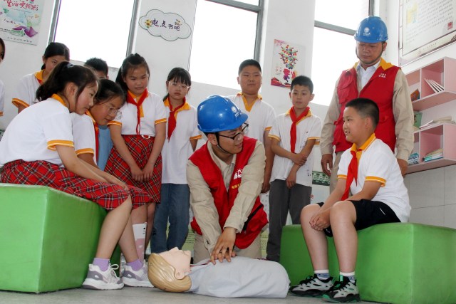 6月14日,国网高邮市供电公司工会志愿者走进高邮市汤庄镇甸垛实验小学五(1)班,通过仿真人现场模拟触电急救心肺复苏法、播放安全用电知识小视频等形式,让小学生了解安全用电及触电急救技能等知识。