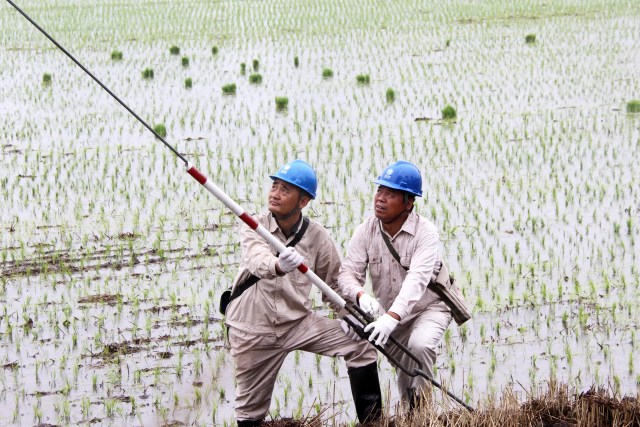 6月19日,国网高邮市供电公司周山供电所员工在周山镇龙胜村一秧田处,紧固10千伏周农线联合东支南分支线14号杆拉线。6月18日高邮境内下起了中雨,雨后该公司组织人员重点对位于农田处的10千伏及0.4千伏电力线路进行巡查,及时消除设备隐患,保障农民夏种期间可靠用电。