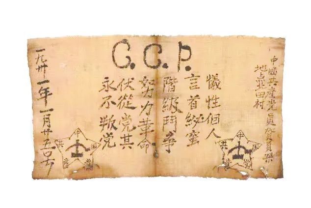 入党宣誓仪式就在贺页朵家的榨油坊举行。微弱灯光下,他举起右手,庄严宣誓。当晚,他把誓词写在提前准备好的红布上,两边还画了五角星,上方是中国共产党的英文缩写“C.C.P.”。那段时期,白色恐怖正在全国蔓延,但贺页朵毫不畏惧,在宣誓书上郑重写下自己的名字、入党时间和地点。