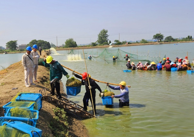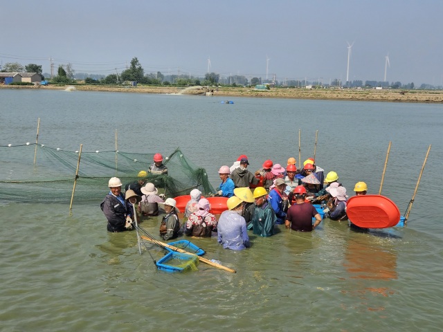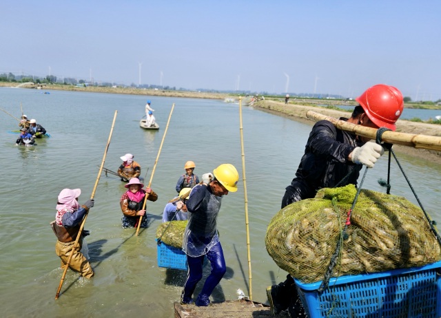 见一筐筐活蹦乱跳的虾装上了货车,吕志明对嵇茂林说:“今天上市的是第二批成品虾,约2050公斤,产量和价格与去年同期持平,今年又是一个丰收年。”