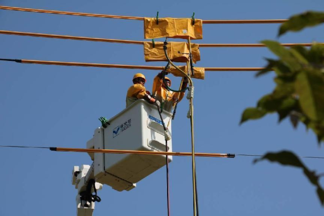 7月17日,国网新沂市供电公司工作人员以不停电作业方式,为10千伏棋城线33至35号杆间线路绝缘外皮老化破损部位加装绝缘护套。(韦强强 杨阳)