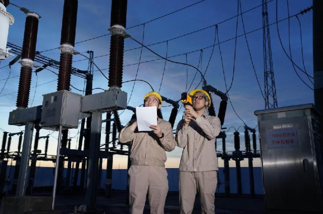 7月31日19时,国网昆山市供电公司运维人员在110千伏陆杨变电站,使用红外测温仪对全站设备开展红外精确测温,确保高温高负荷状态下设备安全可靠运行。(周星佳 温艳玲)