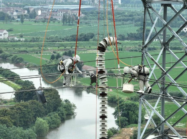7月13日,国网江苏超高压公司输电中心带电作业人员对500千伏西茅5672线060号塔开展带电消缺。图为工作人员正使用叉板法,带电更换该塔上相悬垂串中第11片伞裙脱落绝缘子。(鲍奕 王志明)