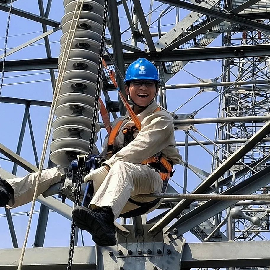输电运检班组新人,下午2点,骄阳似火,缪鹏翔刚刚和同事互相配合成功地更换了220千伏直线塔的复合绝缘子,下塔后坐到阴凉处,一口气喝了一瓶矿泉水,满足地憨憨笑着。