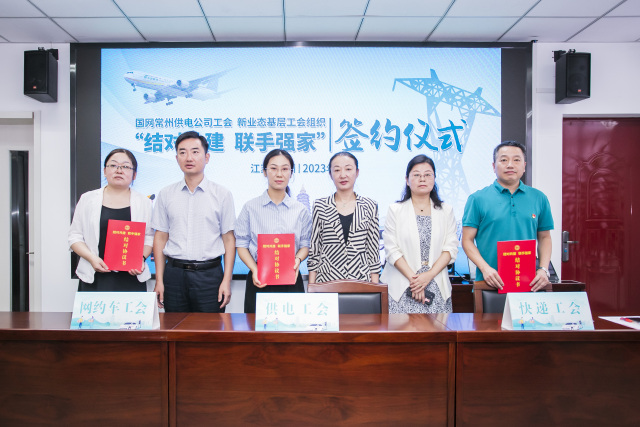 8月16日,常州供电公司工会与常州市快递行业工联会、常州市网约车行业工联会举行“结对共建 联手强家”签约仪式。三方工会代表共同签署了结对共建协议书,开展“思想引领”“制度建设”“口碑实事”“阵地共享”“电能替代”五大行动。