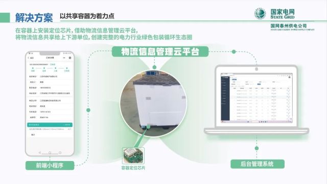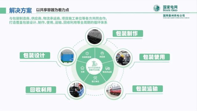 围绕共享容器这一着力点。与包装制造商、供应商、物流承运商、项目施工单位等各方共同合作,打造覆盖包装设计、制作、使用、运输、回收利用等全周期的循环体系。在容器上安装定位芯片,借助物流信息管理云平台,将物流信息共享给上下游单位,创建一个完整的电力行业绿色包装循环生态圈。