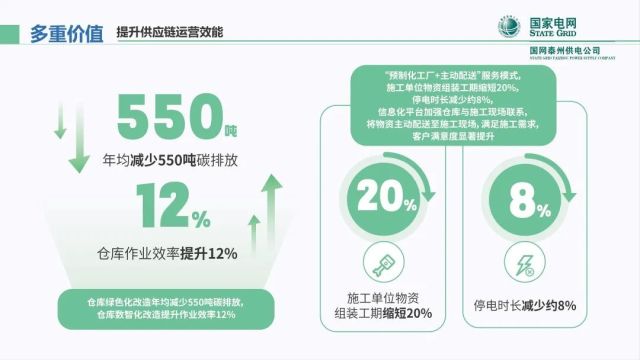 公司围绕“建设绿色现代数智供应链”积极揭榜攻关,针对泰州公司物资供应链存在的上游供应商供货成本高、物资仓库运营效能低、下游施工单位现场协调难等痛点,提出“三点一链”解决思路,即以仓库改造为核心点,共享容器为着力点,主动服务为支撑点,共同构成包括物资“生产工厂、存储仓库、物流配送”的厂储配一体供应链,助力电力供应链绿色转型。