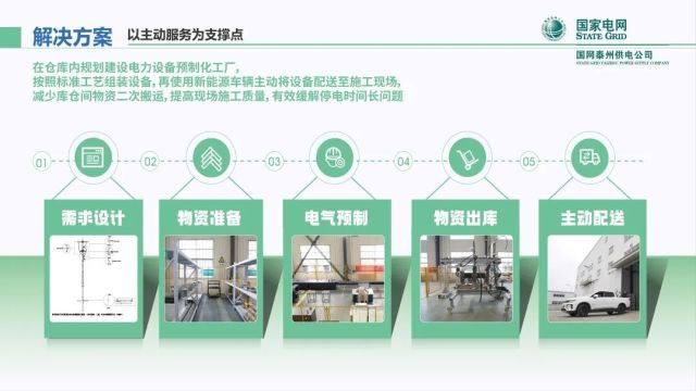 围绕主动服务这一支撑点。在仓库内规划建设电力设备预制化工厂,按照标准工艺在工厂内预先组装好现场所需设备,组装完成后,根据工程排期,主动使用新能源运输车将预制好的设备送达施工现场,减少库仓间物资二次搬运,提高现场施工质量,有效缓解工程施工引发的停电时间长问题。
