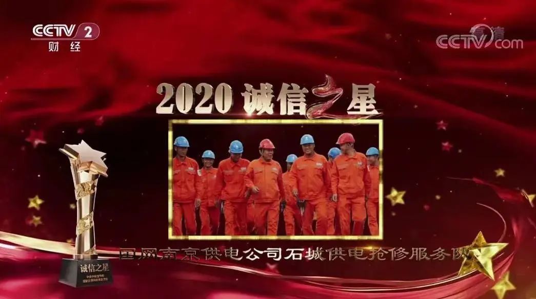 国网南京供电公司石城供电抢修服务队荣获2020“诚信之星”,首次在“诚信之星”的奖杯上镌刻下“国家电网”的名字,其所在党支部获评“全国先进基层党组织”。