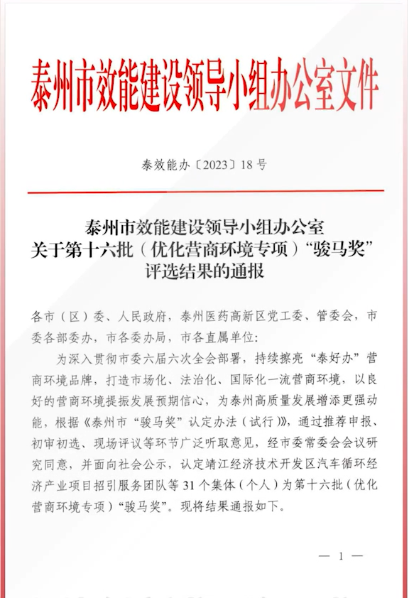泰州供电公司:喜报!公司获优化营商环境专项“骏马奖”