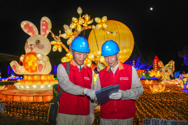 当晚,灯区造型各异的花灯惹人注目,吸引众多市民驻足观赏。陈建平和同事背着工具包,拿着红外测温仪在现场穿行,对彩灯、景观灯及线路设备运行状况开展特巡,保障灯会安全用电。“这几天空气比较潮湿,我们要仔细排查灯组线路有无受潮和虚接风险。”这是陈建平第6年参与中秋灯会保电工作。