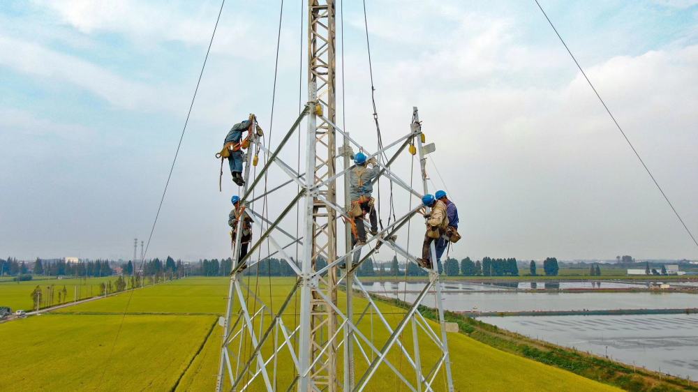 从10月开始,为优化丹阳南部110千伏网络结构,进一步提高供电可靠性,国网丹阳市供电公司工作人员抓住晴好天气进行云林-延陵线路工程杆塔组立工作。该工程为2023年度开工电网网架项目,也是镇江市近10年来首次由县公司独立实施的输变电工程。图为施工人员利用抱杆进行杆塔组立作业。