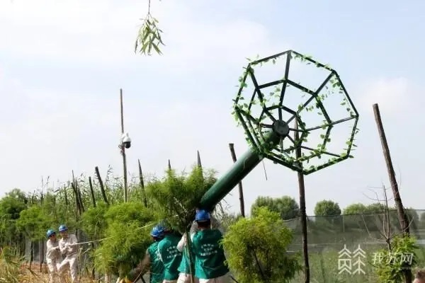 “钢管杆高9米,顶部装有一个直径1.2米的圆棱状钢架,钢架上放些简单的人造绿植。”孙涛介绍,这是在输电铁塔上安装10只人工鸟巢后,为东方白鹳打造的“升级版”人工鸟巢。