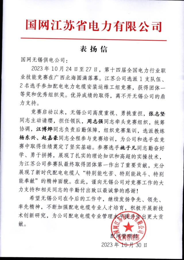10月30日,公司收到来自省公司配网管理部的感谢信,对公司设备部、电缆中心、输电公司员工在第十四届全国电力行业职业技能竞赛中的工作表示了肯定和感谢。