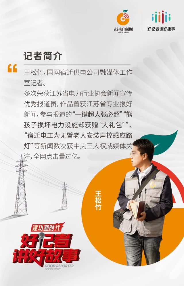 在突发灾情面前,作为一名新闻人,王松竹第一时间连夜赶赴现场,用手中的相机和生动的笔触,将电网人抗灾保电事迹,传递到每位关心灾情进展的人心坎上。宿迁电力人风灾抢修保电被中央广播电视总台、新华社、中国农业新闻网等多家媒体广泛报道。