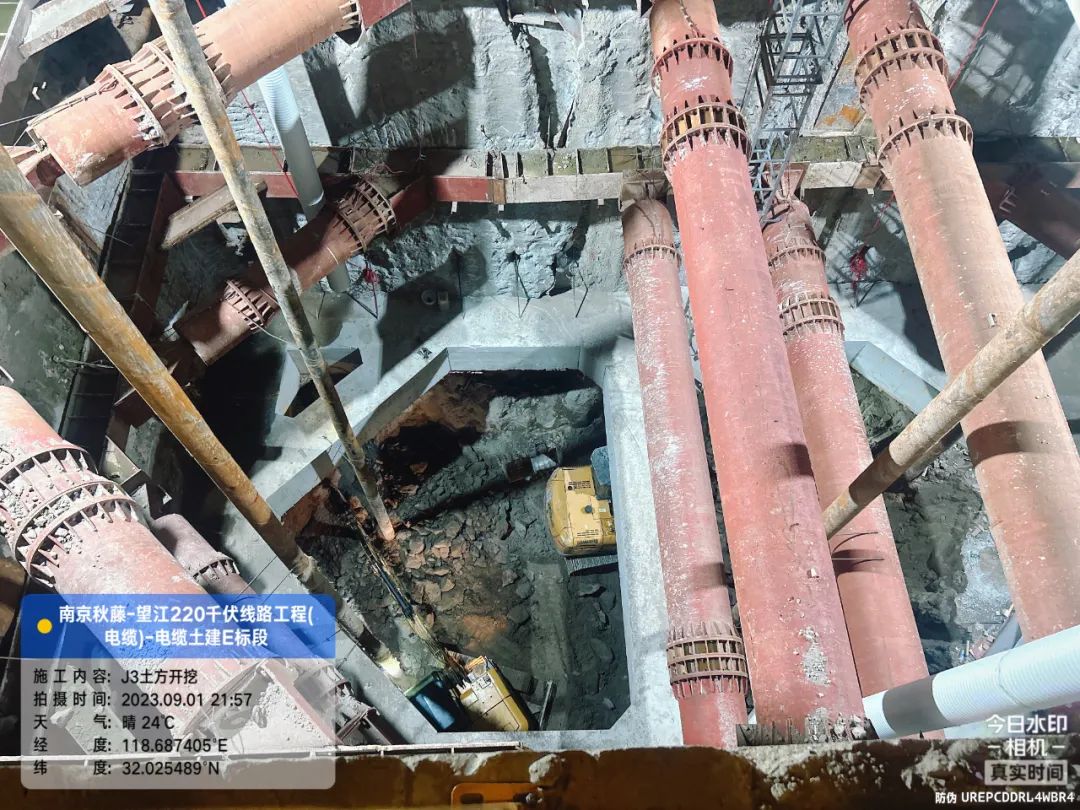 作为整个工程最关键的路线段,J3盾构始发井是南京秋藤~望江220千伏线路工程1095米长盾构段的始发井,它西接长江,东接夹江。其基坑于7月25日正式开挖,历时48天完成,开挖方量超5000立方,开挖深度大,围护结构特殊,紧邻长江,地质条件复杂。