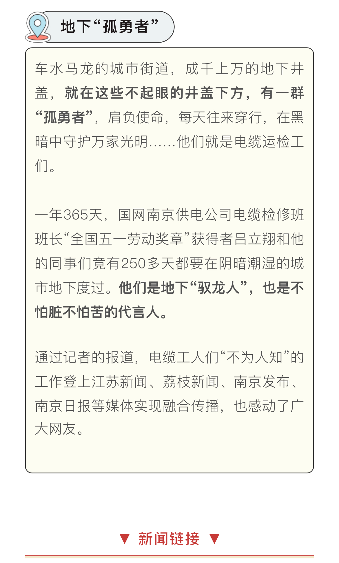 发现、对焦、定格……锁住第一现场聆听、见证、记录……凝聚奋进力量我们,是记者采访的身影活跃在每一个新闻现场好记者好故事地下“孤勇者”车水马龙的城市街道,成千上万的地下井盖,就在这些不起眼的井盖下方,有一群“孤勇者”,肩负使命,每天往来穿行,在黑暗中守护万家光明……他们就是电缆运检