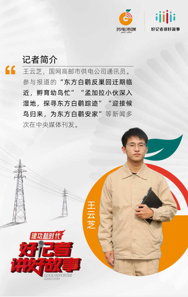 作为一名参加工作不久的年轻通讯员,王云芝紧跟前辈脚步,时常带着相机“拜访”东方白鹳,用镜头和笔触诠释了电网与东方白鹳和谐共生的美丽图景,也呼吁更多人加入保护“鸟中国宝”行列。他参与报道的“迎接候鸟归来,为东方白鹤安家”等系列新闻多次获中央媒体关注转发。