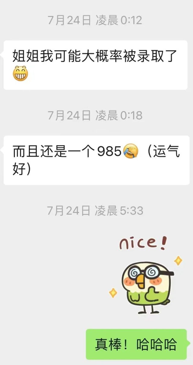 再一次得到小杨的消息,是7月24日凌晨。他主动给我发来微信:“姐姐我可能大概率被录取了!”还配上了一个“笑脸”。随后,他开心地补充:“而且还是一个985!”