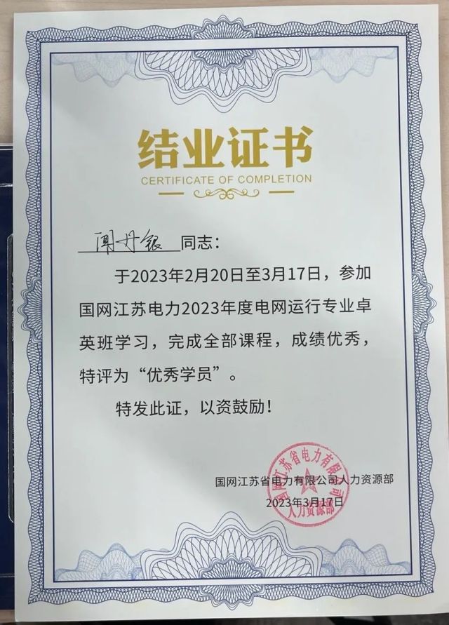 变电运维中心送培学员获得省公司首届技能人才卓英班“优秀学员”